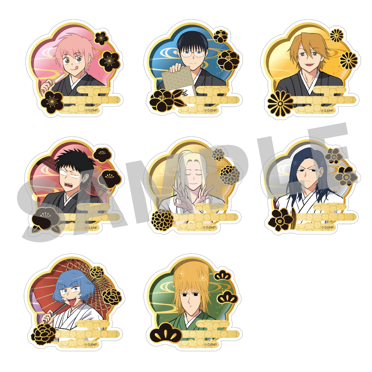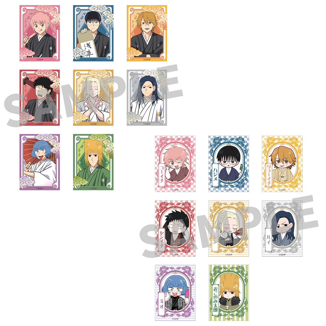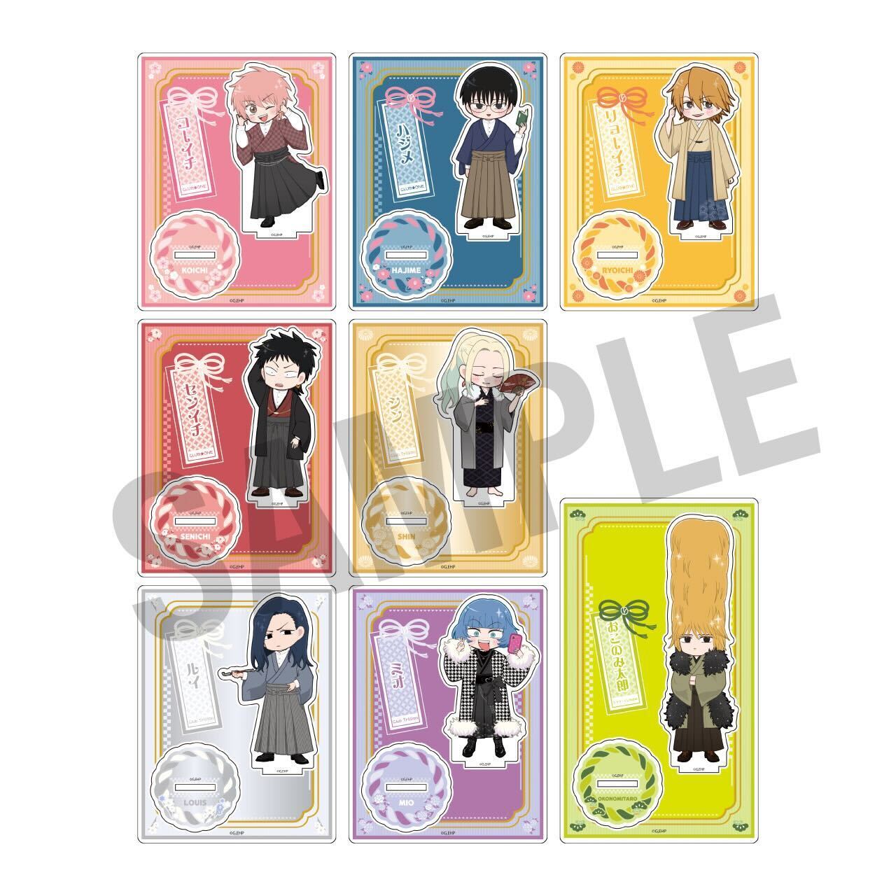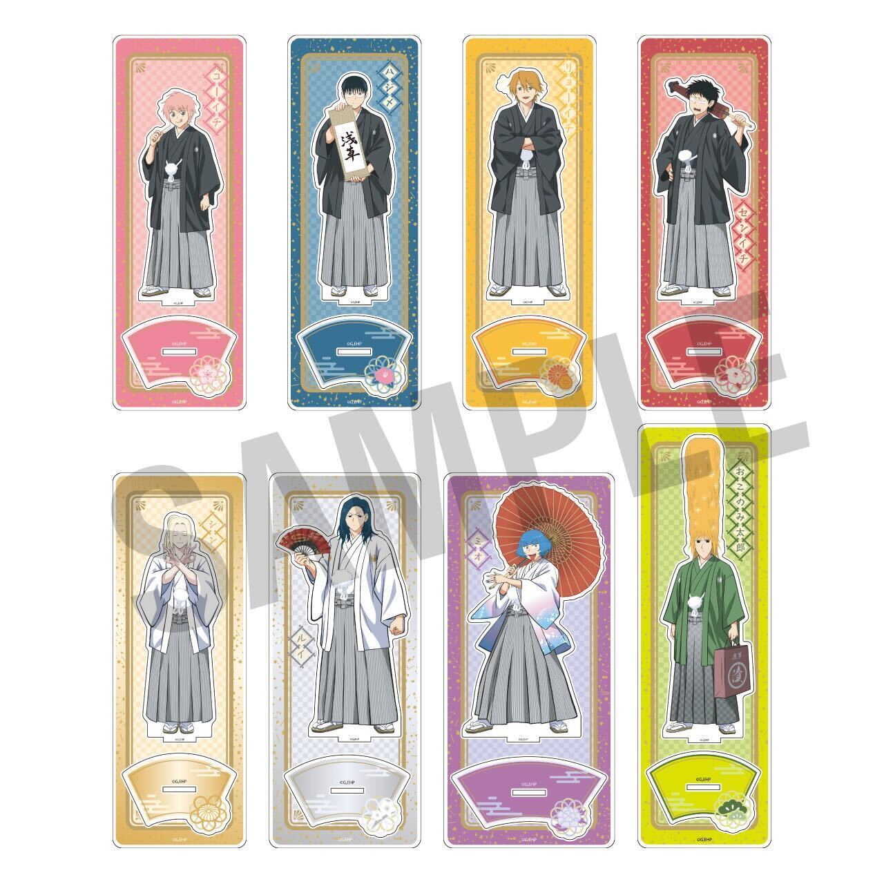 和装で思い思いのポーズをとるキャラクターたち(等身、ミニキャラそれぞれ8名)がアクリルスタンド、缶バッジをはじめ、多彩なラインナップに。