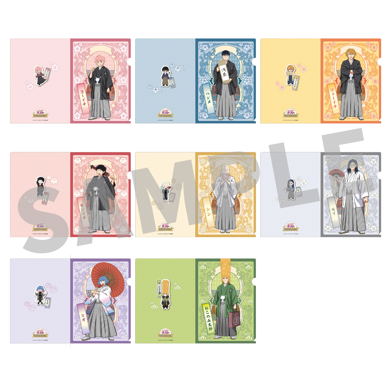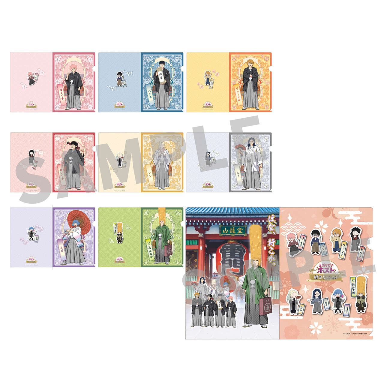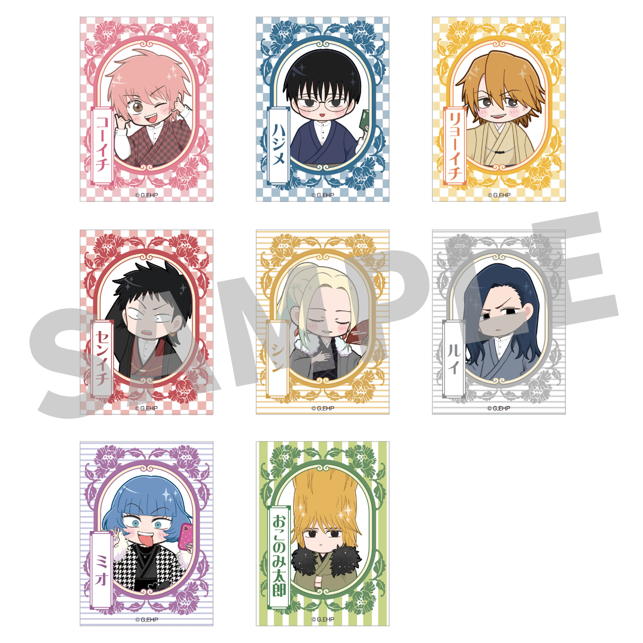 和装で思い思いのポーズをとるキャラクターたち(等身、ミニキャラそれぞれ8名)がアクリルスタンド、缶バッジをはじめ、多彩なラインナップに。