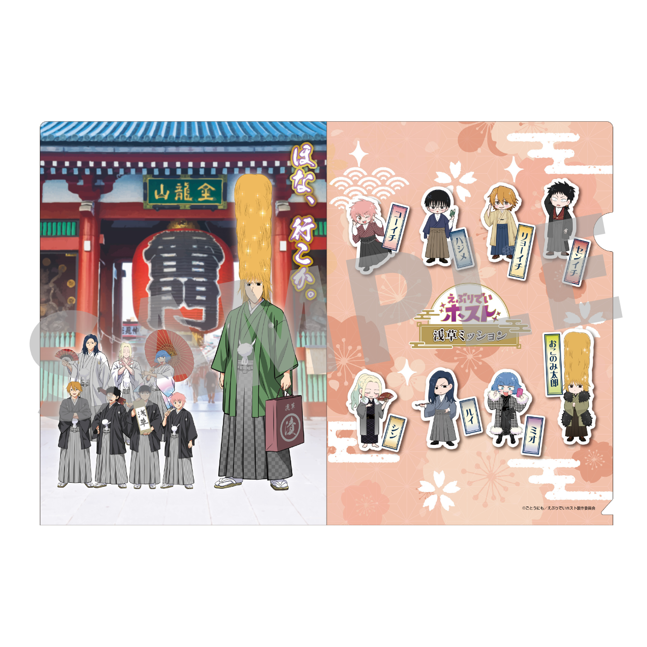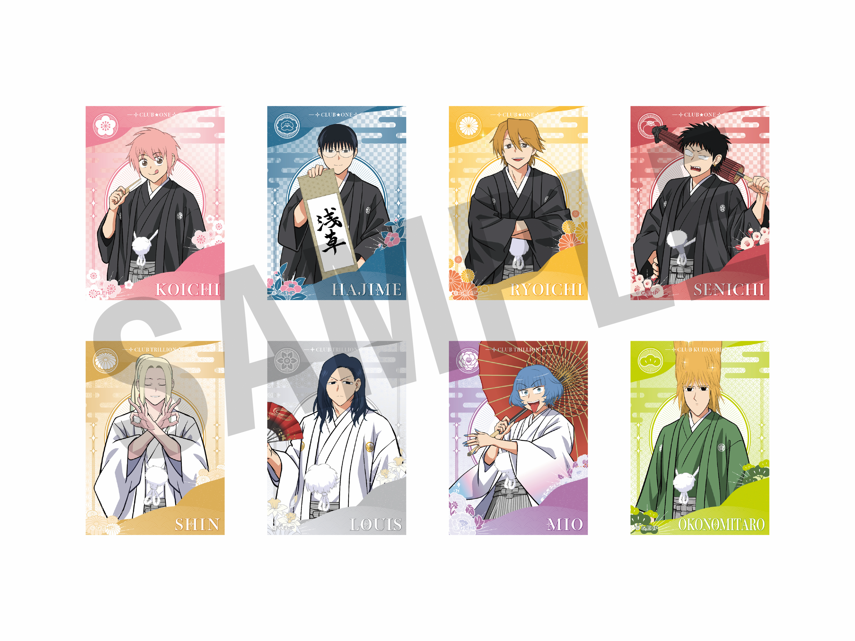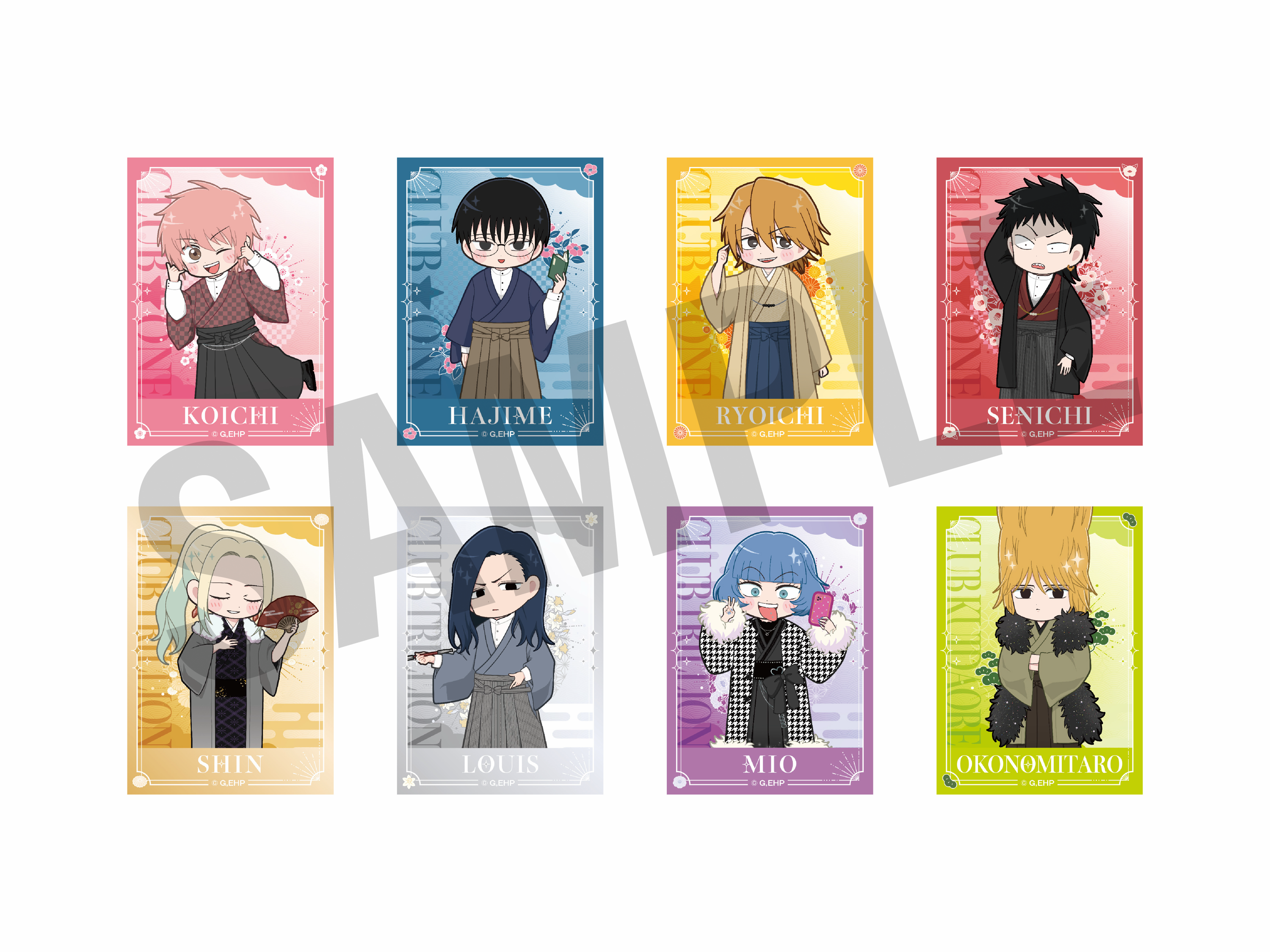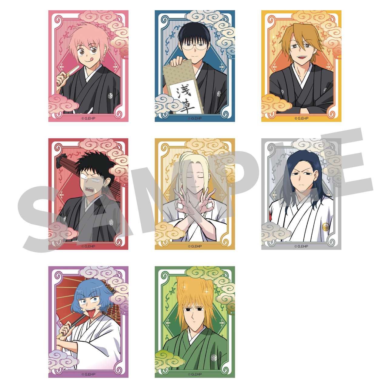 和装で思い思いのポーズをとるキャラクターたち(等身、ミニキャラそれぞれ8名)がアクリルスタンド、缶バッジをはじめ、多彩なラインナップに。